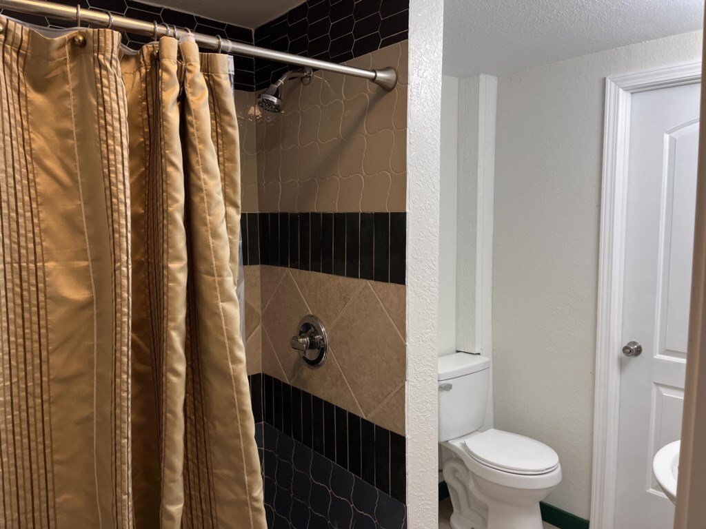 Bath has walk-in shower. Queen bed downstairs and two full beds and one twin bed upstairs. Partially covered deck.
