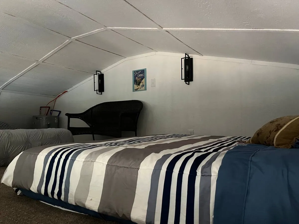 Bath has tub and shower. Downstairs bedroom has king bed and upstairs loft has one king and one queen. Partially covered deck.
