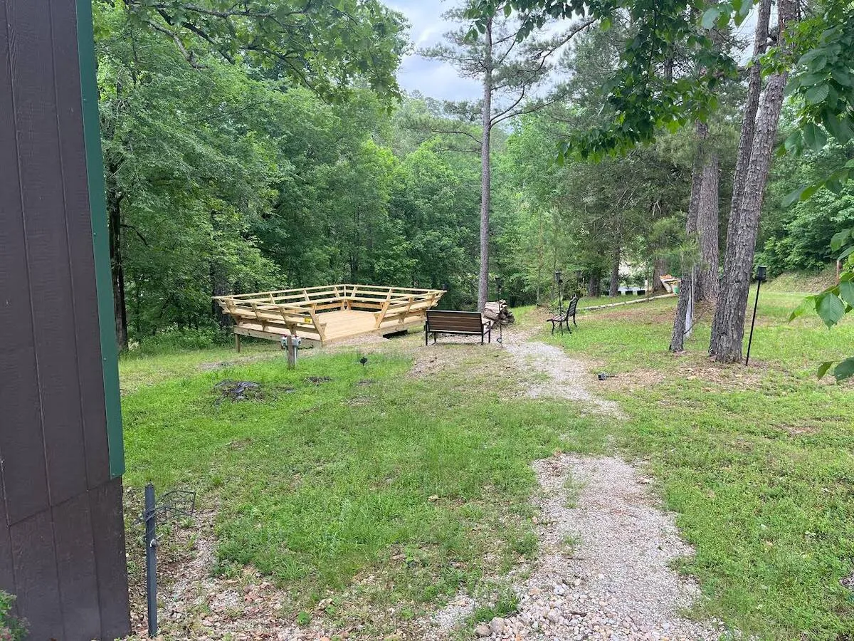 Shared firepit at end of cabin 1 with deck overlooking lake. Enjoy playing horseshoes and walking our trails.