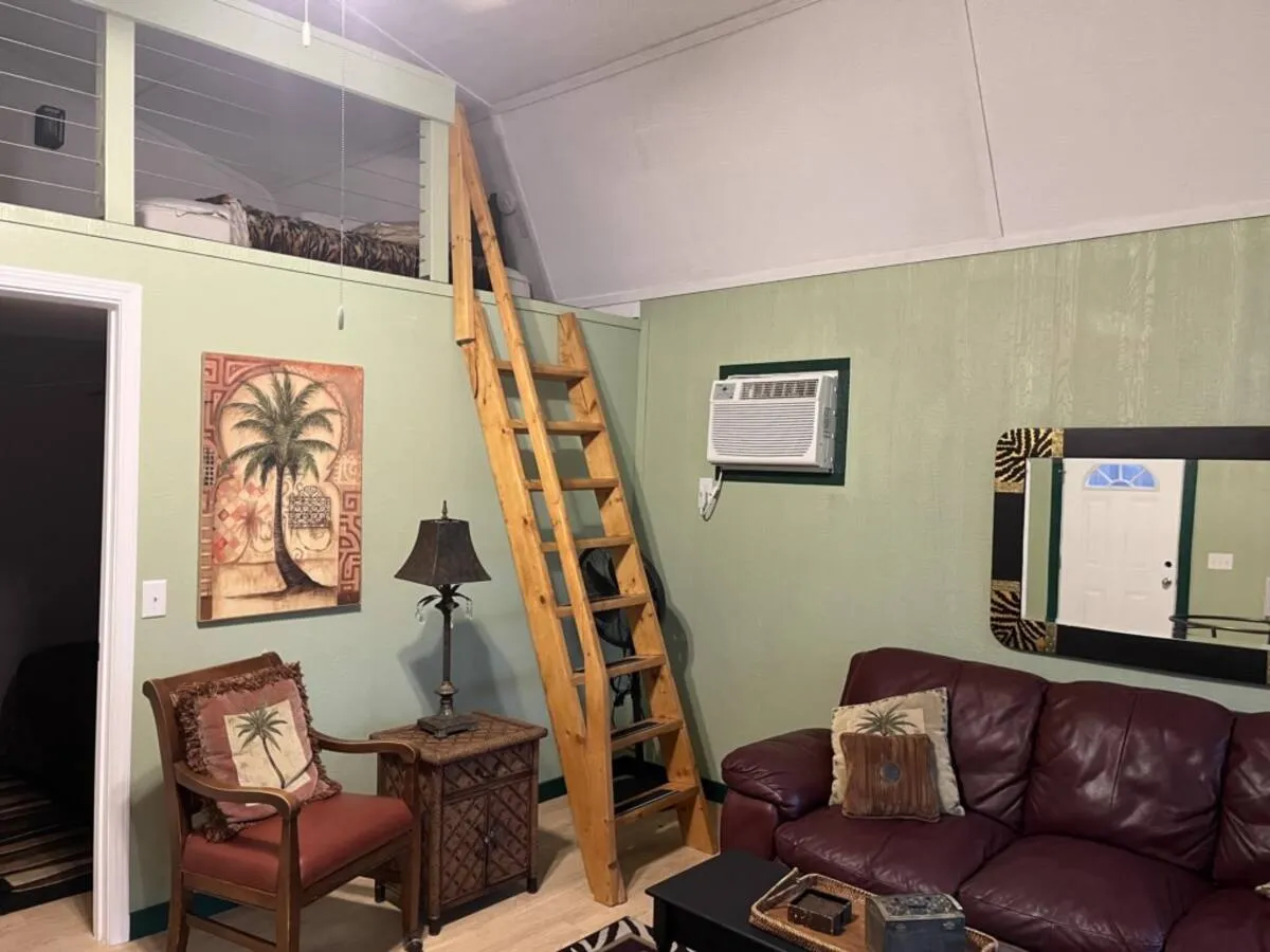 “One to two outside steps leading into cabin, plus a ladder that leads to upstairs loft bedroom.”