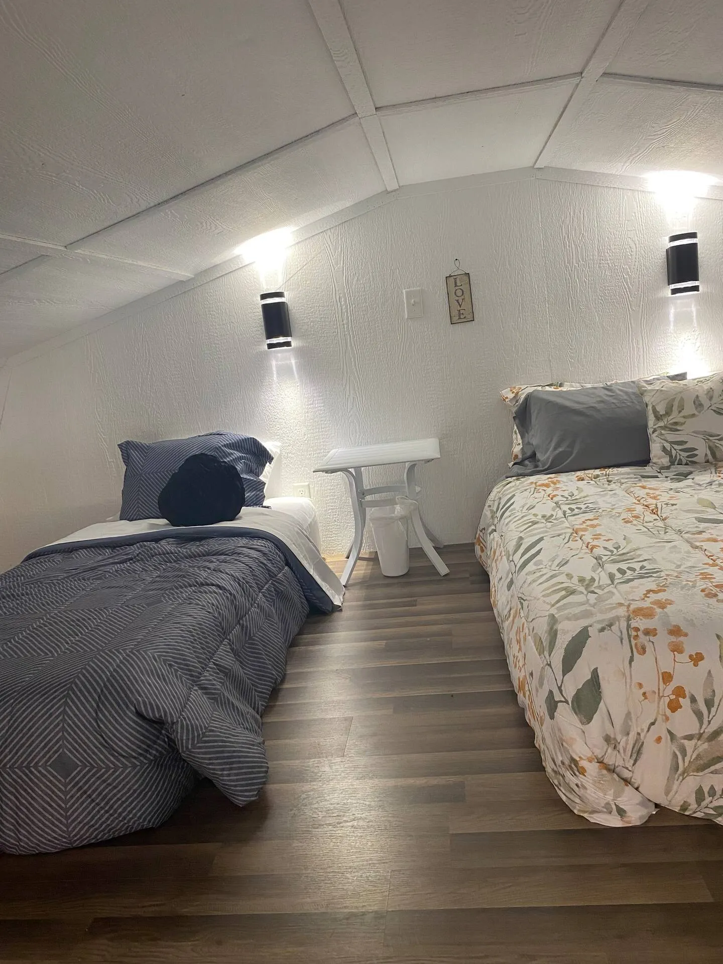 There is a queen bed downstairs and the upstairs loft comes with a king and a twin bed.