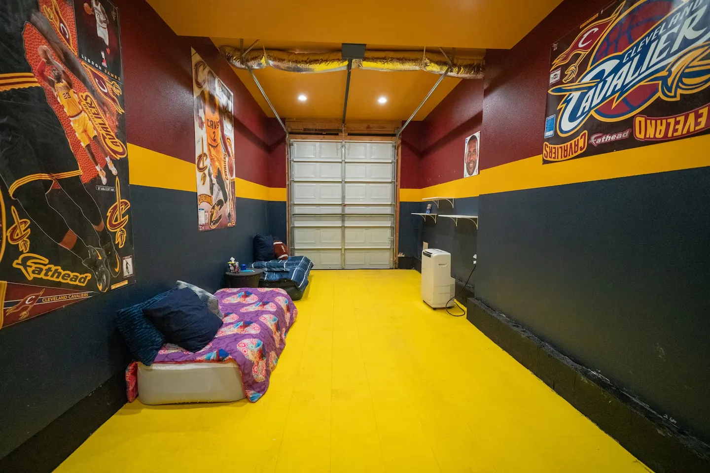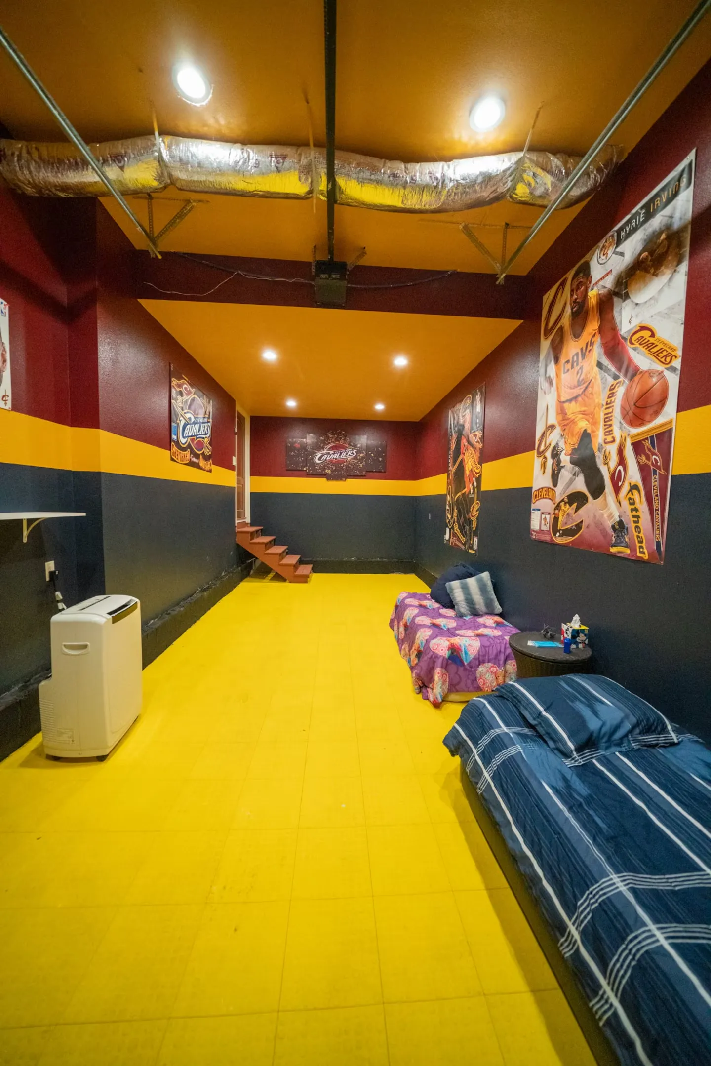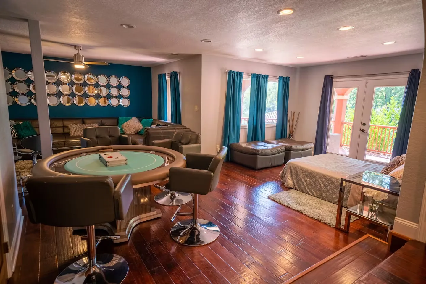 The game room offers additional seating with a full sleeper sofa. The home is located on a sloped front property with a level backyard, providing plenty of space for relaxation.
