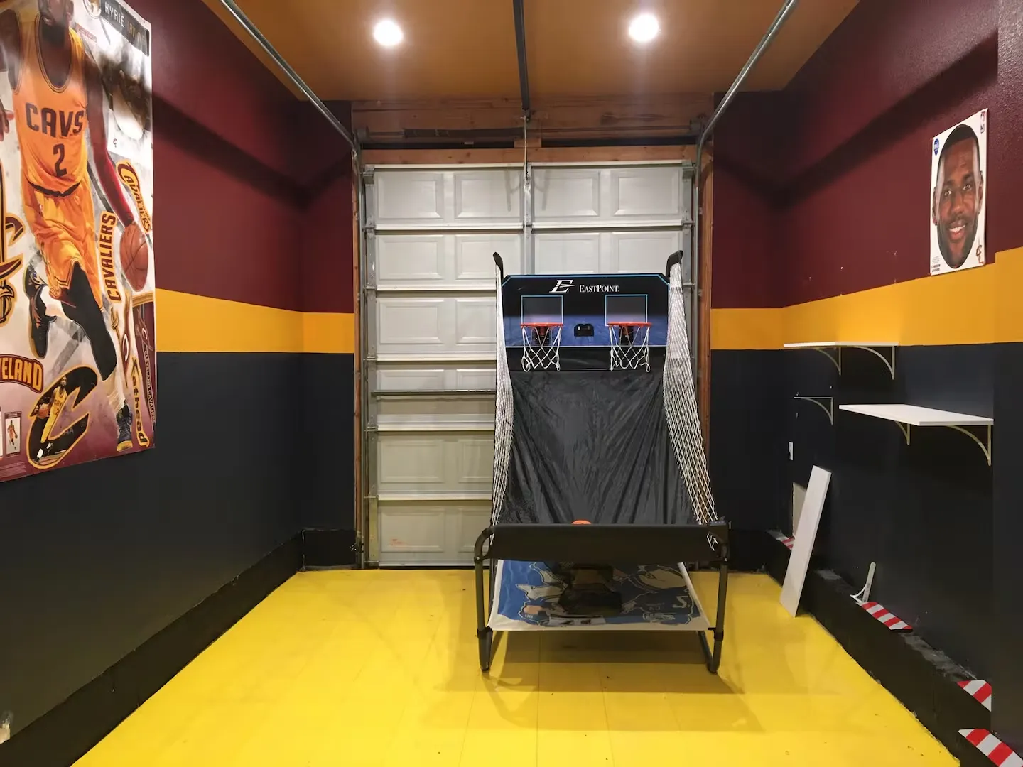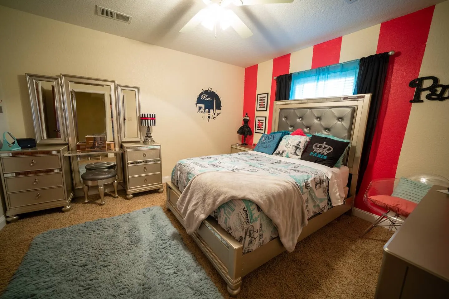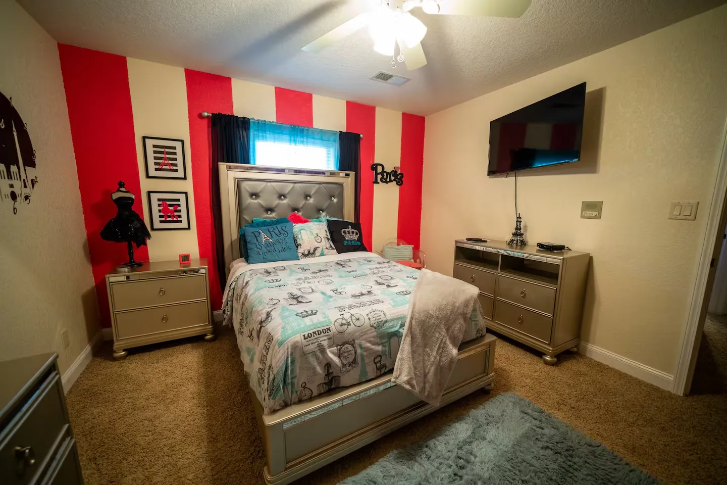 The game room offers additional seating with a full sleeper sofa. The home is located on a sloped front property with a level backyard, providing plenty of space for relaxation.