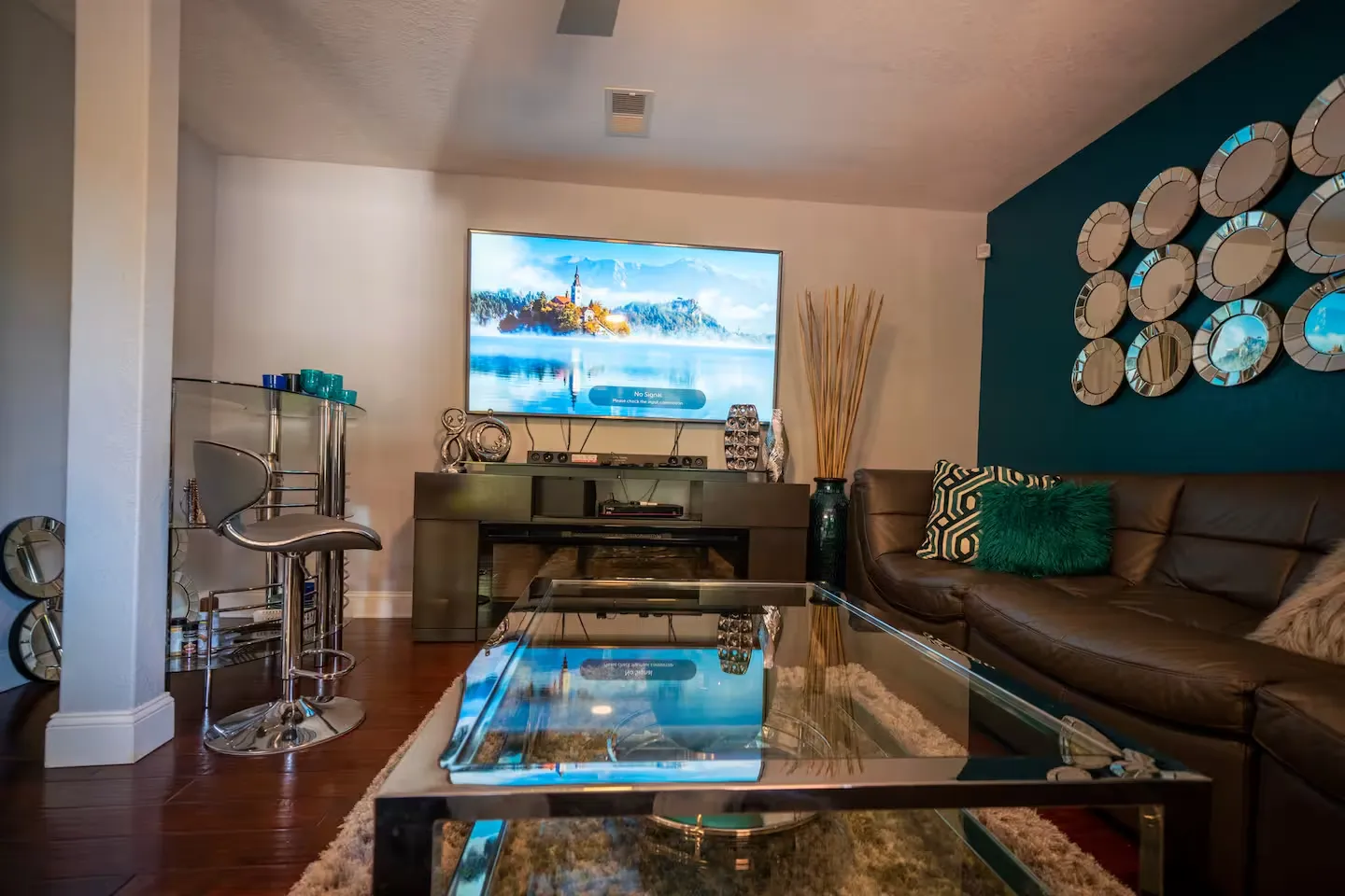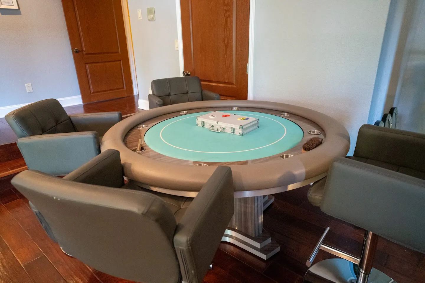 The living room and kitchen are connected by a double-sided gas fireplace, creating a warm and inviting atmosphere. The gourmet kitchen is equipped with sleek granite countertops, a modern 4-door fridge, a double-sized kitchen island, and a wet bar with a wine fridge. There are two additional bars—one on the main level and one downstairs in the family room. The family room also offers a gas fireplace, a big screen TV with Alexa, a card table, and a recreation area with a basketball game and other games for the kids.