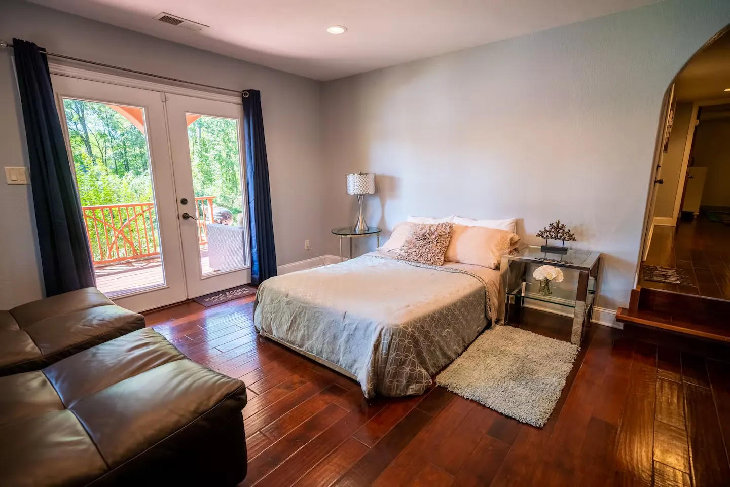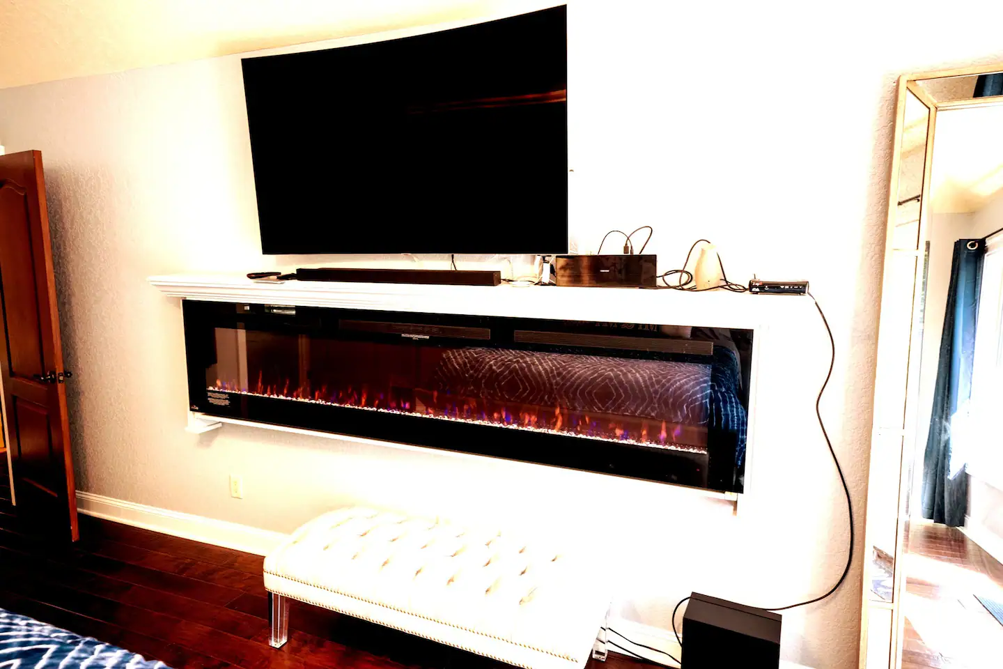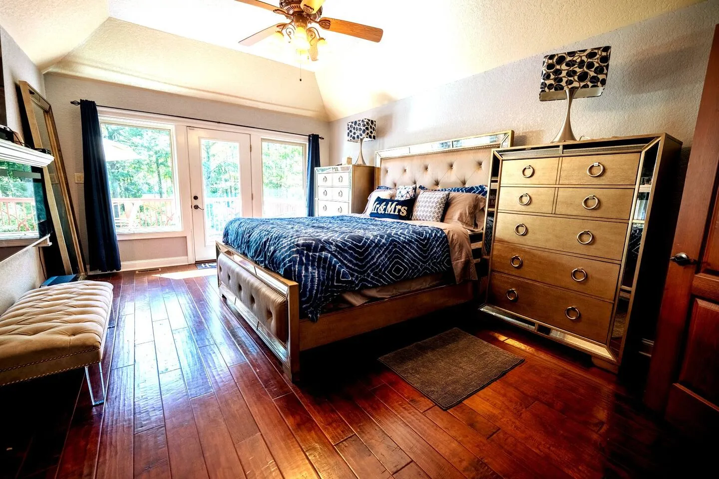 The main-level "Main Suite" features a king-size bed and private exit doors leading to a deck with stunning views of Lake Hamilton. This romantic and elegant room is equipped with a 60" curved flat-screen TV, and beneath the television, you'll find a 9-foot color-changing electric fireplace. The large bathroom includes a spacious whirlpool tub, a walk-in shower, and a walk-in closet/dressing room with built-in drawers.