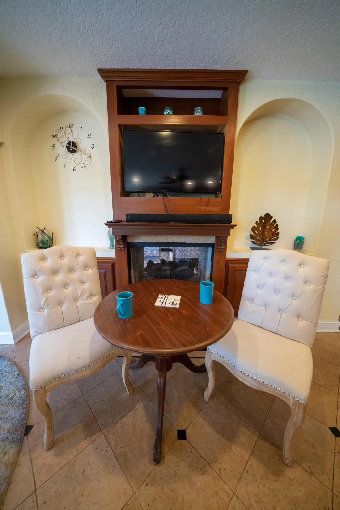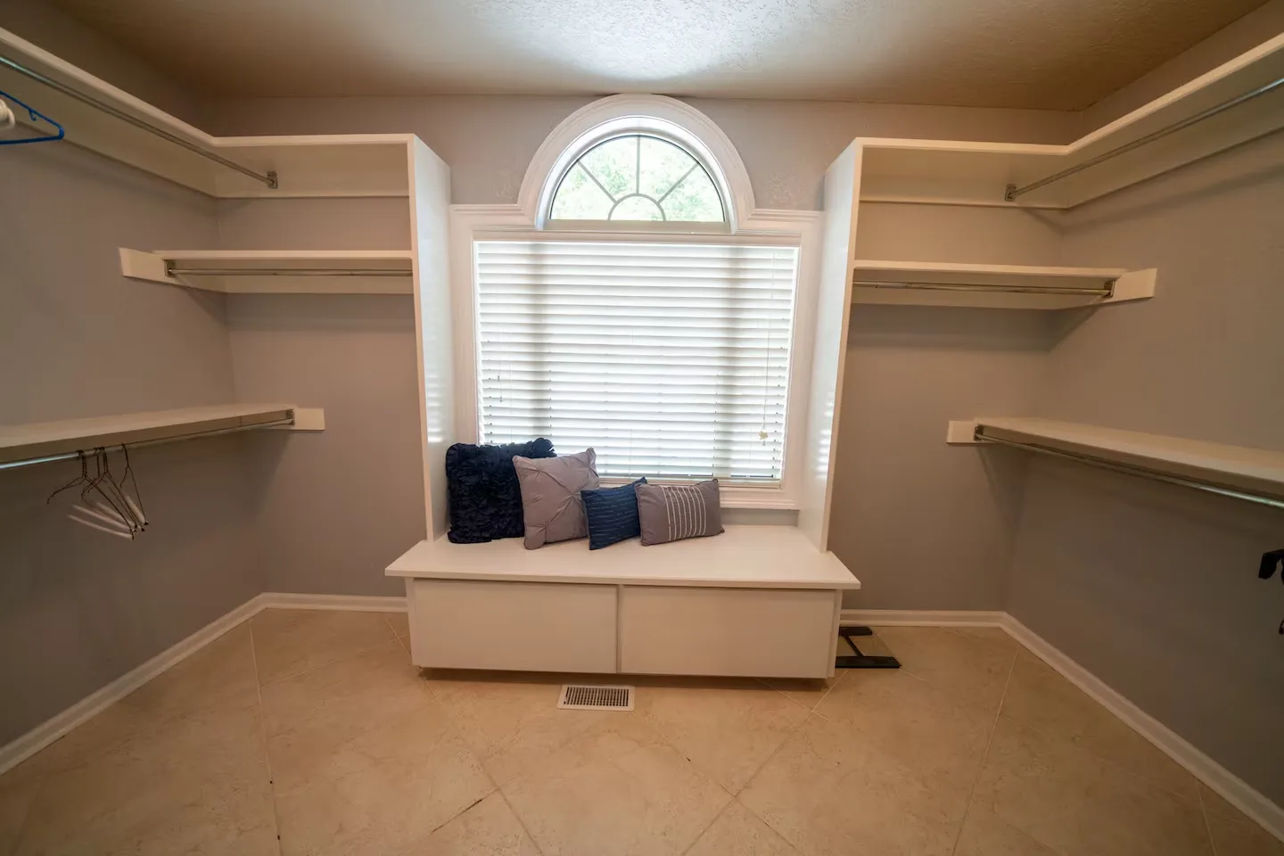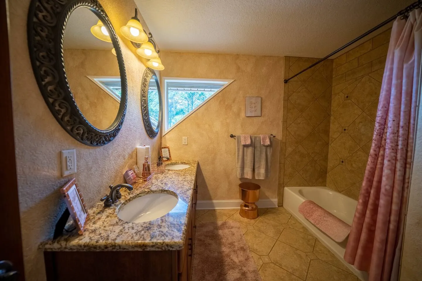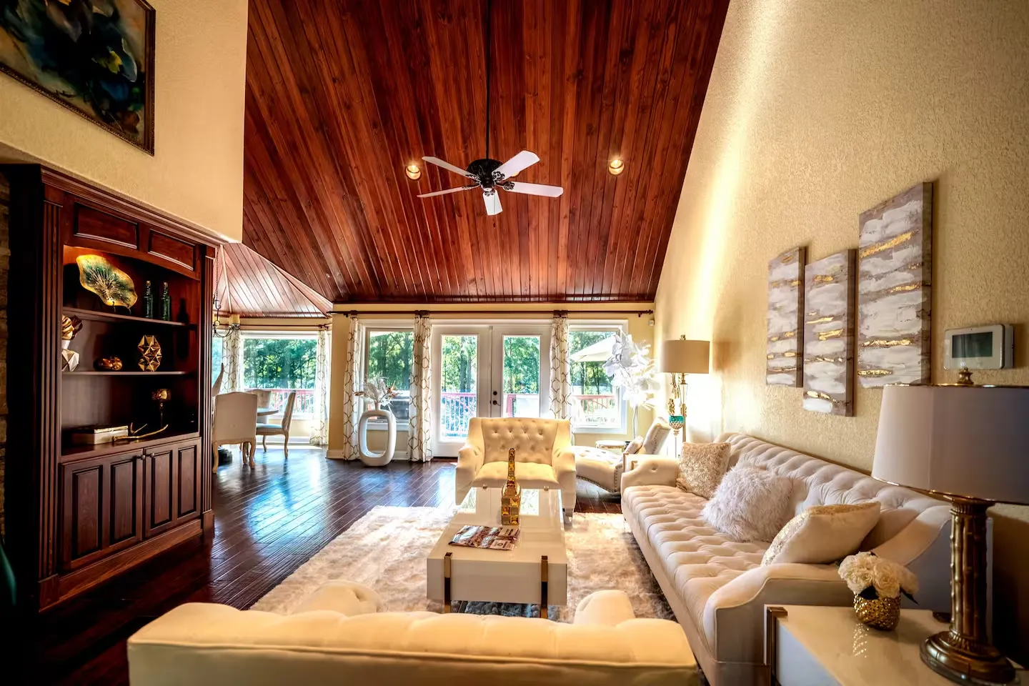 The main-level "Main Suite" features a king-size bed and private exit doors leading to a deck with stunning views of Lake Hamilton. This romantic and elegant room is equipped with a 60" curved flat-screen TV, and beneath the television, you'll find a 9-foot color-changing electric fireplace. The large bathroom includes a spacious whirlpool tub, a walk-in shower, and a walk-in closet/dressing room with built-in drawers.