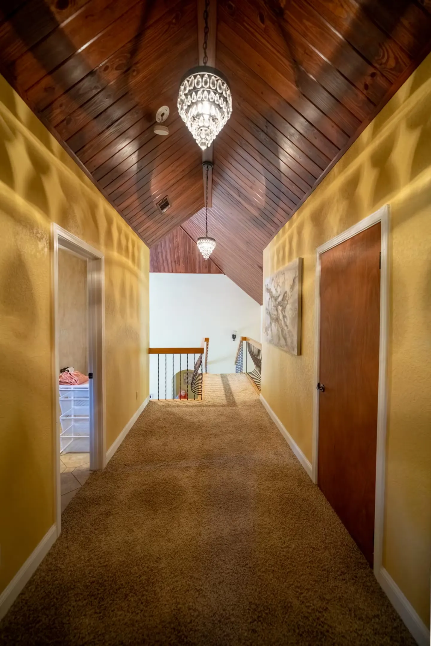 This beautiful brick home, nestled in a quiet inlet with scenic views of the main channel, offers 5 spacious bedrooms, including a Twin over Full bunk bed in the kids' game room. The home is designed with upscale furnishings, soaring wood ceilings, and hardwood floors or tile throughout. A bridge walkway above the living room adds to the open and airy feel of the space.